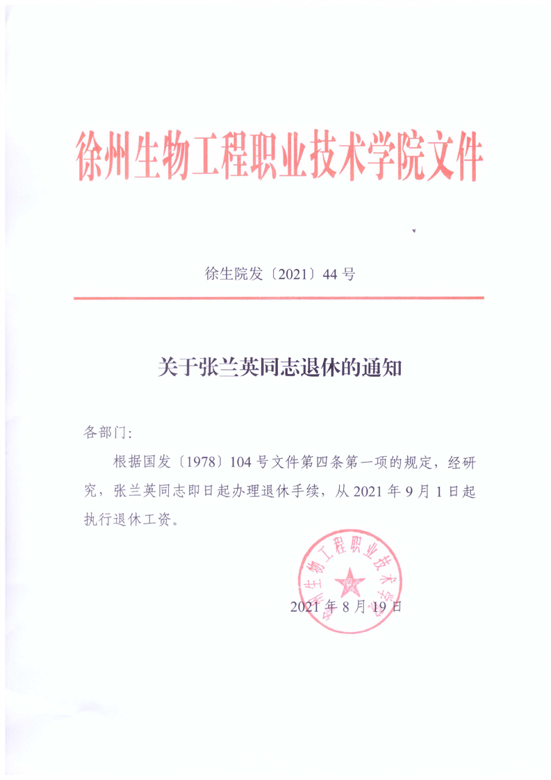 徐生院发〔2021〕44号关于张兰英同志退休的通知